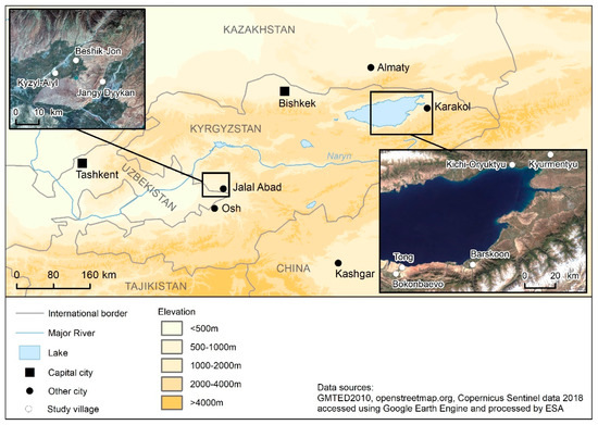 The Issyk Kul region is located in the eastern part of the country and covers an area of 43,735 km2, equalling 21.8% of the total area of the Kyrgyz Republic [31]. Of this area, 22,080 km2 is occupied by the Basin of the Issyk Kul lake and 6236 km2 by the lake itself, the second largest saline lake of the world [32]. The region has a continental climate with average temperatures ranging from −7 to −15 degrees in the coldest winter months (December to February) and 11 to 20 degrees in summer (June to August) (own calculation based on the data of six climate measuring stations in the Issyk Kul Oblast from weatherbase.com). However, the climate is highly variable, from being warm, dry, and temperate in the west of the lake to slightly moist in the eastern parts [33]. The annual precipitation ranges between 132.1 mm in the northwest (Balychy) to 422.7 mm in the east (Tyup) of the Issyk Kul Oblast (data from weatherbase.com). In regards to the impact of natural hazards, the Issyk Kul region is mostly affected by hurricane winds [34]. Overgrazing, and a decrease of species diversity are among the most pressing environmental challenges, followed by droughts and the loss of soil fertility. According to a study published in 2010 by the Food and Agriculture Organization of the United Nations (FAO), 41% of the territory of the region (excluding forestry land) is facing environmental problems [31]. The selected sample villages in Issyk Kul are located on an elevation between 1600 to 1800 meters above sea level (source: Global Multi-resolution Terrain Elevation Data 2010). The population of the Issyk Kul region is 489,800 [35] with a population density of 11.2 people per km2 (based on our own calculation—dividing the population through areas). On a municipal level, several villages are subordinated to one Aiyldyk Aimak which can be translated to “village community”. The sample villages Kichi-Oryuktyu and Kyurmentyu are subordinated to the Aiyldyk Aimak Kuturgu and were located in the district Tyup. The village Barskoon in the district Jeti-Oguz belongs to the Aiyldyk Aimak Barskoon, and the villages Tong and Bokonbaevo in the district Tong belong to the Aiyldyk Aimak Tong and Bokonbaevo (Figure 3).