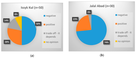 Overall, shelterbelts did not play a prominent role in current land use systems: Only 15 out of 80 respondents (11 in Issyk Kul, 4 in Jalal Abad) had shelterbelts on their agricultural land. The main tree species were poplar (mainly Populus nigra) followed by crack willow (Salix fragilis) and elm (Ulmus minor). One reason for the low adoption rate appears to be a rather negative perception of shelterbelt systems: About 59% of respondents perceived them as overall negative and only 26% as positive, with a generally more positive opinion in Issyk Kul compared to Jalal Abad (see Figure 5). About 14% of the interviewees in Issyk Kul stated that there is a trade-off to plant shelterbelts and that it depends on the site-specific conditions (e.g., size of the land, wind, climate) whether they are beneficial or disadvantageous. In the Issyk Kul region, opinions towards shelterbelts differed greatly from village to village. In Kichi-Oryuktyu, 70% (7) of the respondents had a negative perception of shelterbelts, while in Bokonbaevo, 80% (8 respondents) perceived them in positive terms. In the Jalal Abad region, results were more homogenous, with the majority of interviewees holding a negative perception. Nonetheless, in the village of Kyzyl Aiyl in Jalal Abad, 100% (10 respondents) considered shelterbelts negatively, in contrast to only 40% (4 respondents) in Jangy Dyykan in the same region.