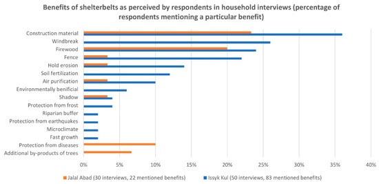 Type of benefits of shelterbelts mentioned by respondents in household interviews in the Issyk Kul and Jalal Abad region.