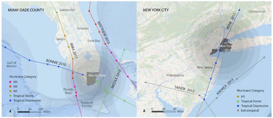 Such complexity aside, identifying the economic effects of adaptation measures on real estate markets is necessary, due to the significant share of the housing market in the urban economies, as well as the view of pragmatic economic dimensions concerning existing urban infrastructures. During the past half-century, a severe storm impacted Miami-Dade County (MDC) every two years and New York City (NYC) every five years [13,14]. Due to the storm intensity and frequency, Miami-Dade County and New York City spent more than $326 million ($18 per capita per year) and $1.6 billion ($38 per capita per year) for on-site adaptation projects from 2012 to 2016 [15,16]. Thus, the study areas, having high storm occurrences and high climate adaptation budgets, serve as clear subjects for analyzing the effects of adaptation measures.