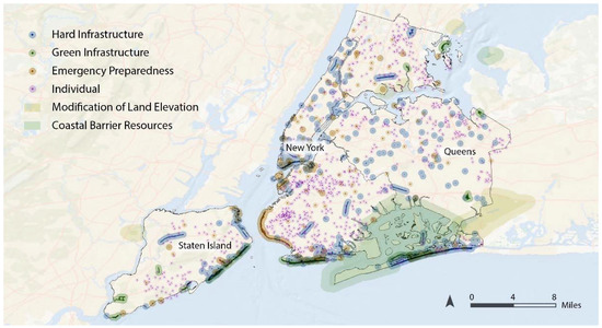 On-site adaptation measures in New York City (NYC). Note: Each circle represents the ped-shed distance of a 400-m radius from hard and green infrastructure, emergency preparedness, and individual projects.