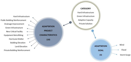 The first is “infrastructural adaptation.” This project type includes hard infrastructure construction such as levees and storm barriers. Since the effects of existing infrastructure would already be reflected in housing prices, only newly added projects are considered in this subcategory. The second adaptation type is “public reinforcement” and includes all projects related to public service building (critical facilities) and infrastructural (e.g., elevating roadways) reinforcements. The third type is “drainage improvement.” Erosion control and stormwater system improvement fall into this subcategory. The fourth type is “green infrastructure.” Improvement of coastal barrier resource systems (CBRS), such as wetlands, lagoons, and salt marshes, as well as green space restoration and beach nourishment, is included in this subcategory. The fifth type is “adaptation facility” and includes provision of new critical facilities to prepare future events. The sixth type is “equipment retrofitting” and includes on-site power generators and installation of pump stations. The seventh type is “hurricane shelter” and includes both existing and new hurricane ready shelters. The eighth and ninth types are based on floodplain revision, but the eight type is elevating housing structure while the ninth type is a modification of the base flood elevation (BFE) by land (based on FEMA’s Letter of Map Revision). The last type is “private building reinforcement” such as installing hurricane shutters, storm panels, and individual property-specific drainage improvements, as well as elevating building foundation by their own expenses.