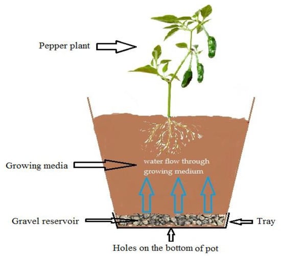 Pepper (Capsicum annuum) was planted in an experimental greenhouse at the University of Almeria for a growing season lasting from June to September 2019. The seedlings were purchased from a local nursery and were ready to be transplanted into pots. The pots presented holes on the bottom and measured 30 cm in diameter and 30 cm in height (21.2 L). Half of the pots were used for surface irrigation (O) and half of them for sub-irrigated planter (SIP). The surface pots were filled only with a growing medium, which was controlled by the weight. In order to construct the SIP systems, the pots were divided into two parts, namely: reservoir below and unsaturated growing media above (Figure 2). A layer of gravel was used at the bottom of each SIP pot as a reservoir (1.5 cm gravel layer for deeper depth and 1 cm layer for the lower growing medium depth), the use of gravel in reservoirs creates a medium that is porous and permeable so that it both holds a substantial volume of water and can be quickly filled.