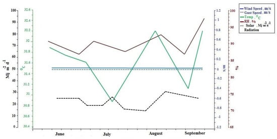 The meteorological data inside the greenhouse effect plant growth. Thus, it is essential to gather such data in order to measure the potential evapotranspiration and crop coefficient. Figure 3 illustrates the meteorological data, including temperature, relative humidity, and solar radiation over the course of the research period. The temperature and relative humidity ranged from 30.9 to 32.2 °C and 88% to 98%, respectively. The peak solar radiation was reached in August.