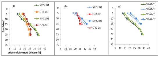 (a) Average volumetric moisture content (%) at 5 cm intervals for SIP D1S and their corresponding surface treatments. (b) Average volumetric moisture content (%) at 5 cm intervals for SIP D2S and their corresponding surface treatments. (c) Average volumetric moisture content (%) at 5 cm intervals for SIP D1 and SIP D2 treatments (note: 0 as the upper boundary (surface layer) of the growing medium in the pot for graphs (a–c)).