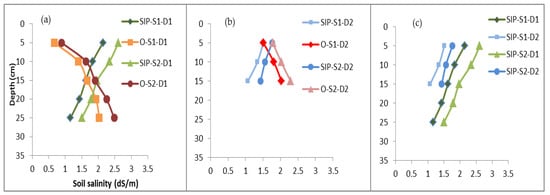 (a) Average soil salinity (dS m−1) at 5 cm intervals for SIP D1S and their corresponding surface treatments. (b) Average soil salinity (dS m−1) at 5 cm intervals for SIP D2S and their corresponding surface treatments. (c) Average soil salinity (dS m−1) at 5 cm intervals for SIP D1 and SIP D2 treatments (note: 0 as the upper boundary (surface layer) of the growing medium in the pot for graphs (a–c)).