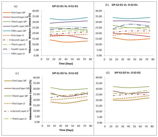 (a) Average volumetric moisture content (%) for SIP-S1-D1 vs. O-S1-D1 over the growth period. (b) Average volumetric moisture content (%) for SIP-S2-D1 vs. O-S2-D1 over the growth period. (c) Average volumetric moisture content (%) for SIP-S1-D2 vs. O-S1-D2 over the growth period. (d) Average volumetric moisture content (%) for SIP-S2-D2 vs. O-S2-D2 over the growth period (note: for graphs (a–d): D1 treatments: first layer: 0–5 cm, second layer: 5–10 cm, third layer: 10–15 cm, fourth layer: 15–20 cm, fifth layer: 20–25 cm; D2 treatments: first layer: 0–5 cm, second layer: 5–10 cm, third layer: 10–15 cm).