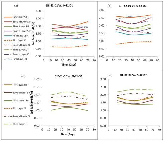 (a) Average growing medium salinity level for SIP-S1-D1 vs. O-S1-D1 over the growth period. (b) Average growing medium salinity level for SIP-S2-D1 vs. O-S2-D1 over the growth period. (c) Average growing medium salinity level for SIP-S1-D2 vs. O-S1-D2 over the growth period. (d) Average growing medium salinity level for SIP-S2-D2 vs. O-S2-D2 over the growth period (note: For graphs (a–d): D1 treatments: first layer: 0–5 cm, second layer: 5–10 cm, third layer: 10–15 cm, fourth layer: 15–20 cm, fifth layer: 20–25 cm; D2 treatments: first layer: 0–5 cm, second layer: 5–10 cm, third layer: 10–15 cm).