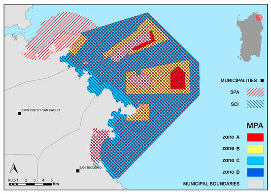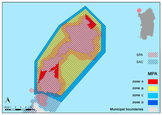 On the one hand, Directive 2014/89/EU defines maritime spatial planning as a cross-cutting policy tool enabling the application of a coordinated, integrated and trans-boundary ecosystem-based approach, which promotes smart, sustainable and inclusive growth and ensures sustainable use of marine and coastal resources []. On the other hand, Directive 2008/56/EC recommends ecosystem-based approaches for marine strategies, so that pressure of human activities does not compromise the capacity of marine ecosystems to respond to human-induced changes and the sustainable use of marine goods and services is ensured to present and future generations []. In Italy, according to article 2 subsection 3 and article 3 subsection 4 of the Decree of the Ministry of Environment, Land and Sea Protection (in Italian: Ministero dell’Ambiente e della Tutela del Territorio e del Mare, MATTM) published on 17th October 2007, the management of Natura 2000 sites located within the boundaries of an MPA is in charge of the MPA managing authority. Therefore, the MATTM demanded the integration of Natura 2000 conservation measures into MPA regulations in order to efficiently manage the area.