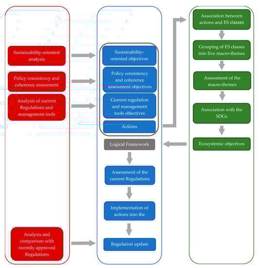The research was articulated into two phases: In the first phase, the methodological approach to update the regulation in the light of Natura 2000 conservation measures was defined; in the second phase, the analysis of the constitutive elements of the PS and their assessment in light of the ESs was conducted.