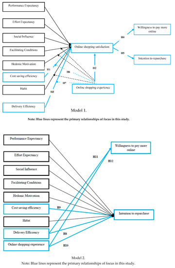 The extended unified theory of acceptance and use of technology (UTAUT-2), an extension of UTAUT, is one of the most successful theories for examining the behavioral intention to use technology [110]. This current study examines the drivers of online purchasing behavior. Willingness to pay and intention to repurchase is considered an application of the “behavioral intention” concept in online shopping. The present research uses UTAUT-2 to investigate the relationships among CSE, DE, customer satisfaction, intention to repurchase, and WTPM. The new version of UTAUT-2 has been extended by adding two new variables, delivery efficiency and willingness to pay more. This study adopts the construct “price value,” from UTAUT-2, which is restructured as “cost-saving efficiency” or CSE. This has resulted in variances of WTPM (R2 = 0.29) and an intention to repurchase (R2 = 0.58), being significant enhanced compared to previous study on UTAUT-2 in the online shopping context [32,33,40,111,112]. Overall, our study confirmed the important roles of delivery efficiency, cost-saving efficiency, and shopping experience in influencing online shopping and in UTAUT-2.