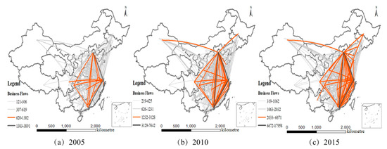 Specifically, second-level-associated cities in the UESDN from 2005 to 2015 are shown in Table 1. The number of second-level cities in the network and average enterprise flows gradually increased, indicating that industrial agglomeration and synergetic-development capacity between cities strengthened. In addition, the pattern of development gradually changed from the hub-spoke model based on provincial eastern capitals to the network of eastern and central cities. Combined with the distribution of enterprises and enterprise-flow intensity, the increased enterprise flows were mainly distributed among provincial capitals and existing associated cities.