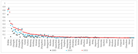 As shown in Figure 4, degree-centrality distribution is consistent with long-tail distribution and has an obvious trend towards the right, indicating that most cities in the process of industrial agglomeration have less influence, and a few key cities formed a relatively close network. From 2005 to 2015, the variation coefficient of degree centrality decreased from 1.993 to 1.469, which indicates that the capability gap of cities is gradually narrowing.