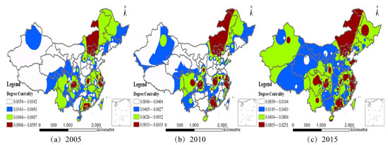 As shown in Figure 2, in 2005, the developed provincial capital cities with significant mediation were mainly Suzhou, Hangzhou, Chongqing, Kunming, and Xi’an, and they had close interaction with others through economic factors. In 2010, with the development of the industrial economic system and urban economy, some developed cities’ intermediary role became increasingly prominent (Zhengzhou, Wuhan, Guangzhou, and Haikou). These cities are important transportation hubs that enhance the turnover ability of domestic production factors. In 2015, production factors’ transferring effect of existing cities, such as Beijing, Shanghai, Nanjing, Suzhou, Hangzhou, Wuhan, Guangzhou, Shenzhen, and Kunming, became more significant, indicating that the status of these cities further improved.