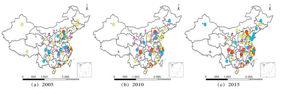 From 2005 to 2015, the number of cities in subgroup 3 increased from 22 to 34, which consisted of mainly eastern coastal cities such as Dongguan, Zhuhai, Wuhu, Yangzhou, Quanzhou, Wenzhou, Lianyungang, and other provincial capital cities (e.g., Shijiazhuang, Nanchang, Changchun, Guiyang, and Jilin). To some extent, the core degree of these cities increased, mostly in the second and third levels, which implied that the number of core fulcrums and their influence on the pattern under the background of industrial agglomeration are constantly increased. Subgroups 4–6 were mostly prefecture-level cities in various regions. Although core degree and subgroup density slightly increased, they remained at a relatively low level. In addition, the variation coefficient of subgroup density decreased from 1.028 to 0.826 between 2005 and 2015, indicating that the urban-group pattern tended to be balanced. Furthermore, average density within the six subgroups increased from 0.129 to 0.261, showing that self-organization and correlation increased within each subgroup.