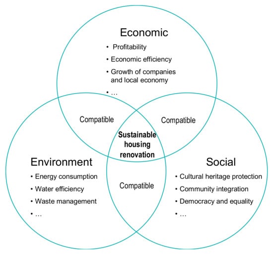 Based on the TBL model, the sustainability of housing renovation can be illustrated as three partially overlapping circles, as shown in Figure 2. The first circle represents the economic goals of sustainability in housing renovation, which is typically related to, for example, the profitability of real estate companies, the economic efficiency of the resource allocation, the growth of the companies and the local economy. The second circle represents the environmental goals of sustainability in housing renovation which usually refers to the performance in terms of energy consumption, water efficiency, waste management, and so forth. The third circle represents the social goals of sustainability in housing renovation which contains broad and sometimes easily overlooked topics, such as cultural heritage protection, community integration, safety, health, democracy and equality in housing, and so forth.