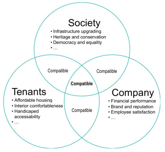 The economic, environmental and social aspects of sustainability are logically independent but also systematically interconnected by factors at different levels that firms are expected to address at the same time [34]. Sustainable housing renovation is expected to simultaneously target economic, environmental and social goals, as shown in the central compatible part of Figure 2. However, we expect that the ideal situation of simultaneously fulfilling the three goals is typically difficult to reach. It is true that in some cases, a housing renovation solution for reaching one goal may be beneficial also to another goal. For example, recycling building material can save money and benefit the environment at the same time. Such a case lies in the overlapping segment of the economic and environmental circles in Figure 2, where the economic and environment goals are compatible. In other cases, in contrast, a housing renovation solution for reaching one goal may be detrimental to another goal. For example, the increasing use of environmentally friendly construction materials may, in some cases, harm the profitability of a real estate company. In this case, there is a conflict between the economic and environmental goals. This creates a dilemma for the company’s decision making.