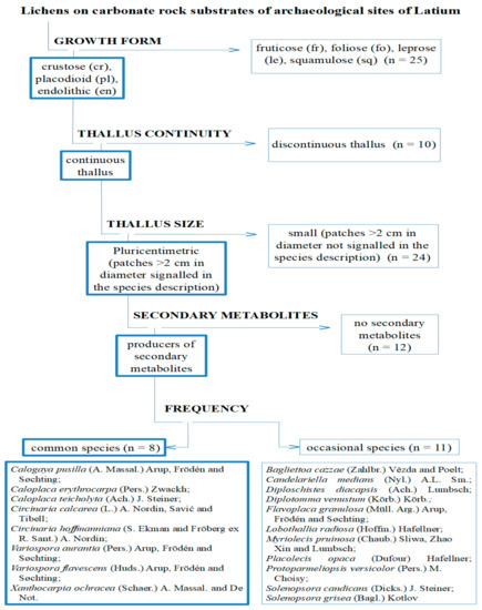 - Nimis, P.L.; Monte, M.; Tretiach, M. Flora e vegetazione lichenica di aree archeologiche del Lazio. Studia Geobot. 1987, 7, 3–161. [Google Scholar]