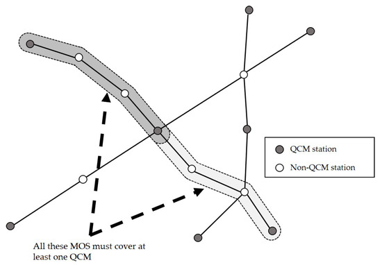 First, with the maximal ordered subset (MOS) defined in Table 1, this problem can be basically viewed as a set-covering problem. Figure 2 illustrates the definition of MOS and the basic idea of the set-covering formulation. If at least one QCM is included in all the MOSs for each bus route, we can confirm that no full battery discharge occurs during the bus’s traversal of that route, since MOS is defined as the maximal distance that an e-Bus can drive without needing a battery swap. By incorporating the definition of MOSs, the following formulation can be proposed to minimize the overall number of QCMs.