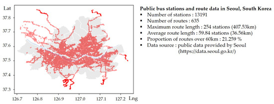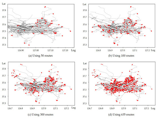 In this section, we run numerical experiments with the three proposed mathematical programming models in Section 2 and evaluate them with the actual bus transit network data of the Seoul metropolitan area, South Korea. All the bus transit network data used in this experiment are available at [26]. When it comes to the driving range of the e-Bus, the electric bus under consideration can drive up to 60 km with a fully charged battery, according to [13]. All the experiments were performed using an Intel(R) Core(TM) i7-4770 CPU at 3.40 GHZ with 32 GB memory.