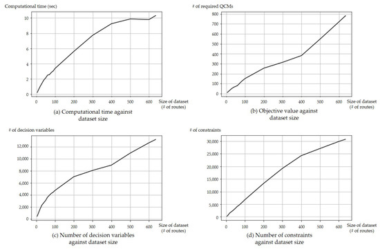 As the graphs in Figure 4 show, we observe that there exists a linear relationship between dataset size and the number of decision variables as well as the number of constraints. We remark that, in the set-covering model, the variable y is the only decision variable, and the number of constraints is almost equal to the size of the dataset. Moreover, for each route r, there are at most number of MOSs. Thus, despite the complexity of the model structure, at least the number of variables and constraints does not increase exponentially, and we can learn that empirically the computational time of the model also increases linearly. This model seems quite easy to use experimentally to solve this problem, at least for our dataset. However, this also shows the limitation of the set-covering model of not giving intuition about where to swap a battery.