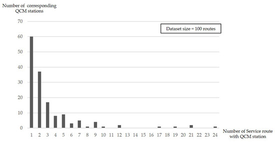 Figure 11 presents QCM station distribution in terms of the number of bus routes they service for battery swapping. For example, while one QCM station serves 24 bus routes, 60 QCM stations serve only one. Considering this, limiting the maximum number of bus routes served by a QCM station, would allow QCM service rates to be appropriately balanced.