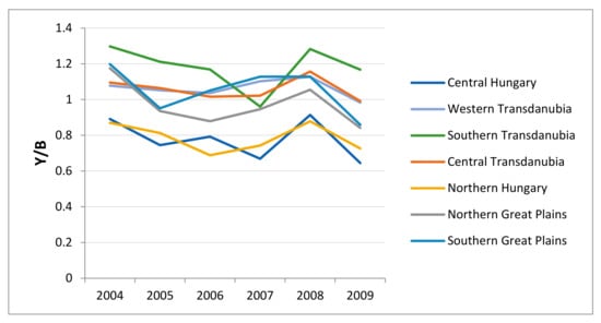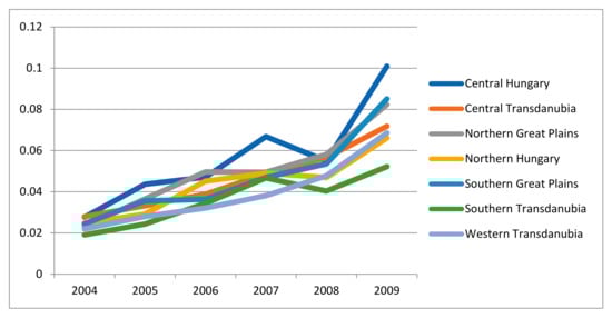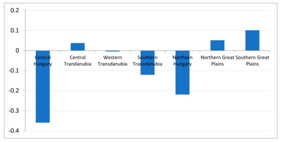 Figure 4 shows the development of land productivity in the Hungarian regions (NUTS 2 level) over the period of investigation. In this figure, land productivity in the regions is measured relative to the average land productivity in the sample. Two regions had below-average land productivity—Northern Hungary and Central Hungary. The other regions had above-average productivity, with the highest in Southern Transdanubia. In these regions, land productivity was about 20% higher than average. One more issue had to be considered—the ranking of the regions according to land productivity remained relatively constant over the years. This suggests that our conjecture that we could assume a constant term for the impact of heterogeneity was supported by the data.