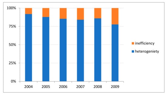 It has already been mentioned that heterogeneity might have a greater impact on production than inefficiency. To check this conjecture, the share of heterogeneity and inefficiency on variation of output was calculated (Figure 3). Results confirm that heterogeneity is much more important than inefficiency. The latter is only responsible for 5–20% of the total variance of these sources. This suggests that not considering heterogeneity in estimations can lead to totally misguided policy recommendations.