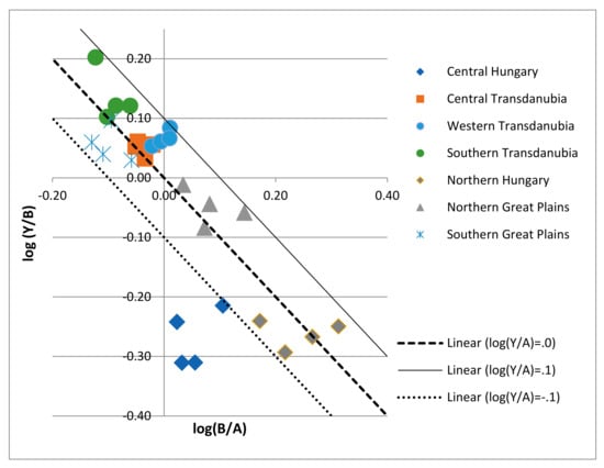 Figure 5 provides more details of the technologies used in Hungarian grain production. It displays the relationship between the three indicators labor productivity (Y/A), land productivity (Y/B), and land-man ratio (B/A) for all regions over time according to references [36,37].