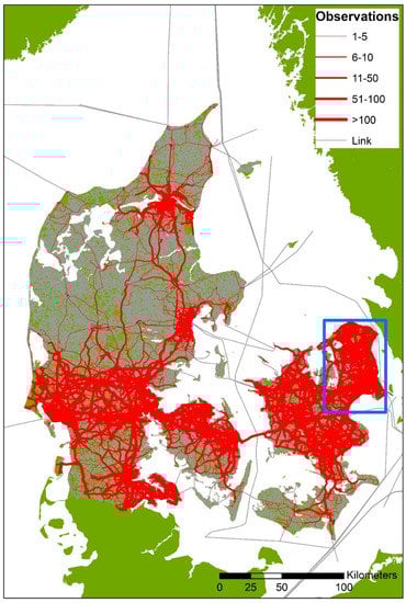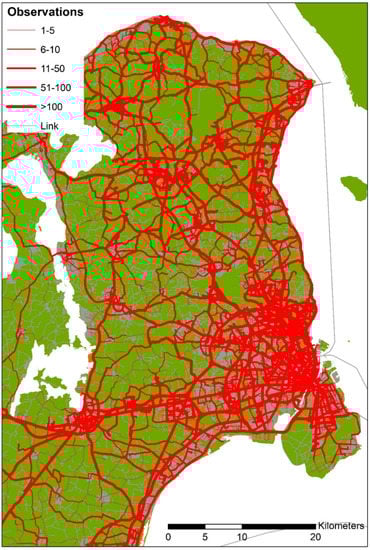 For each observed route, data from the local weather stations provided information about the weather at the time and day of departure including precipitation, wind, temperature and visibility. Figure 1 and Figure 2 illustrate the spatial distribution of the observed routes to show that they cover a large part of the network over the 13 municipalities that are distributed across the whole country. Figure 1 shows the distribution over Denmark, where intuitively the most populated eastern island also had most of the observations, while Figure 2 zooms in on the Copenhagen Region.