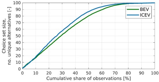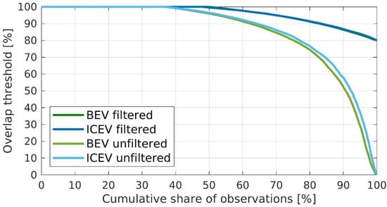 The choice set generation procedure and subsequent filtering resulted in a total of 6678 observed routes in the ICEV periods and 8968 observed routes in the BEV period. Figure 3 illustrates the cumulative distribution of observations at various thresholds for the minimum overlap with the observed route (for a definition of overlap, see [60]). It can be seen that the doubly stochastic choice set generation reproduced over 75% of the observed routes for both datasets with an 80% overlap threshold. Moreover, the procedure replicated link by link about 50% of the observed routes after the filtering, an impressive feature considering the level of detail of the network. These results indicate that the choice set generation method was successful in reproducing the observed routes within the generated choice sets.
