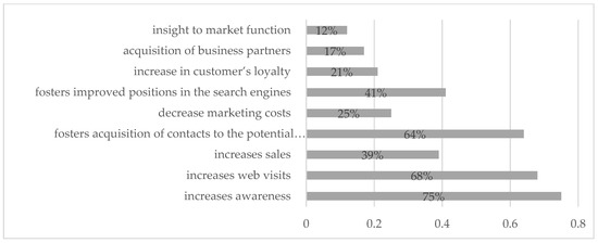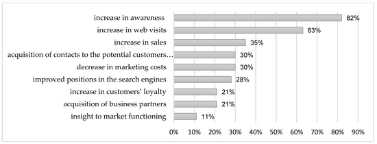 Our own repeated survey on a sample of 87 companies in 2019 is fully in line with the trends described in the previous survey. Figure 2 summarizes the influence of social media marketing on awareness, which increased by 75%. Similarly, web visits also increased by 68%, sales by 39%, and fostering acquisition of contacts to potential customers increased by 64%. In contrast, the need for marketing costs decreased by 25%. Social media marketing also fostered improved positions in the search engines by 41%, motivated an increase in customer loyalty by 21%, fostered an acquisition of business partners by 17%, and facilitated insight into market function by 12%.