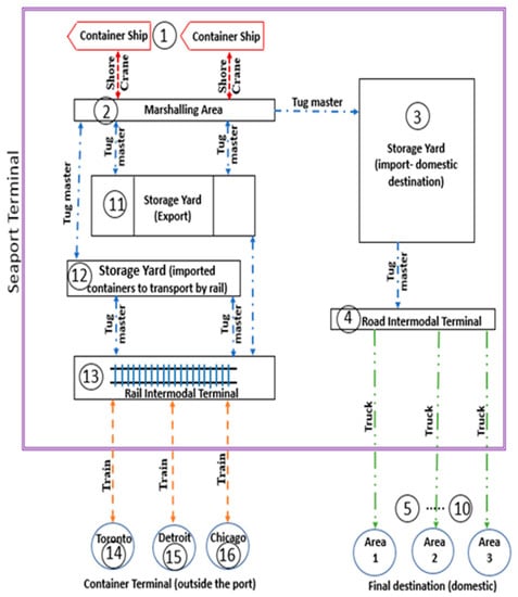 4]. The current study uses the concept of the dry port by introducing a new container terminal far from the seaport in the proposed layout model. Thus, the result of solving such problems and overcoming the challenges will be the increase in terminal productivity. Moreover, it will minimize transportation time, cost, and emissions (sustainability), followed by an increase in the capability of the container terminal to meet the recent high demand for containerization. However, this paper makes a comparison between the common layouts of the container terminal with a new proposed developed layout. This comparison is in terms of cost and emission generated by different equipment and modes of transportation used in transferring containers from the container ship to their final destination. The multi-objective optimization approach has been used to optimize the model. In this paper, we took the case of Port of Montreal to validate the proposed model.
