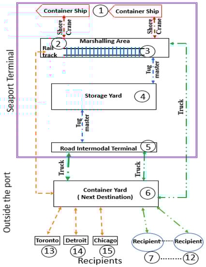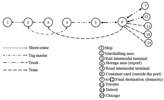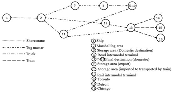 is a network graph presenting the network of the container terminal and next container terminal, which is located outside the seaport. is a set of nodes, where every node represents a specific element in the terminal. For example, a node could represent a ship, marshaling area, storage yard, intermodal road terminal, intermodal rail terminal, or container yard, which is the final distance in this modal.