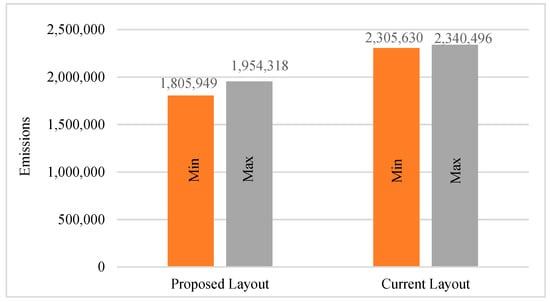 Figure 9 shows a comparison of the minimum and maximum values of emissions between both layouts. In addition, the flow of containers became smoother, where the congestion was minimized.