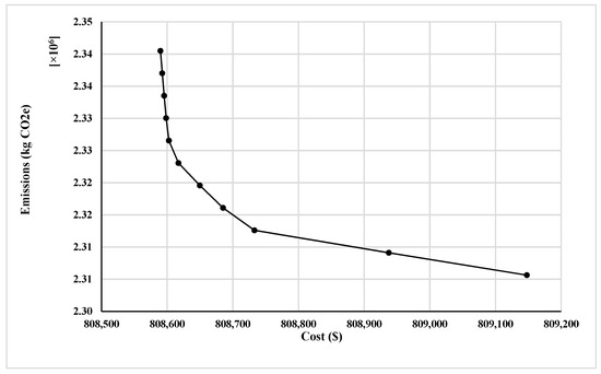 Figure 2, and this is the common layout in many terminals. In this section, we will solve both Port of Montreal and proposed layout as a bi-objective function problem to minimize the cost function, and GHG emissions function simultaneously. We will also present a comparison between them. In order to use the ε-constraint method for both layouts, the emission function was minimized to find the bounds of the objective function. Then, this value was used as a constraint in addition to constraints, Equations (13)–(22) to minimize the cost function. The right-hand-side value of the emission function changes in each iteration of the ε-constraint method by adding the ε value for the iteration to the lower bound of the emission function. The solution depends on the decision-makers’ preferences, if the emission has higher priority, they will choose the solution with low emission and high cost, or they can tradeoff between the number of emissions and the cost to find an acceptable solution which meets minimization of emissions and cost. In order to derive the solution, we had used the ε-constraint method for the Multi-objective problem, which thereafter generate the Pareto set with varying solutions. So, the problem is reformulated by keeping the cost function as an objective function and transforming the emission function to a constraint. Eventually, the implementation of the