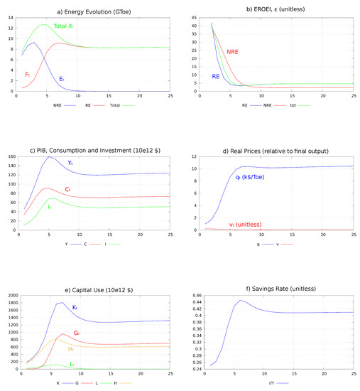 The development of contemporary industrial societies over the last two hundred years has relied on an intensive use of fossil fuels offering high EROEI ratios. Such resources have allowed our economies to allocate most of their labor and man-made ressources to other activities than energy production and have thereby contributed to economic expansion and diversification (see a.o. Cleveland [7]). However, a downward trend of the EROEI at a macro level is likely. On the one hand, NRE resources of high quality are progressively depleting and the exploitation of the residual resources is accompanied by a fall in their EROEI (e.g., Hall et al. [8]), either because their energy density is lower and/or because their extraction gets—directly or indirectly—increasingly energy-intensive. On the other hand, most types of RE seem characterized by lower EROEI ratios than conventional NRE (e.g., [8] and Cleveland [9]). Hydropower is an exception but the possibility of developing it further at a global level is limited. If several RE technologies are mature or near-mature (hydroelectricity, wind energy), technical progress in one or another type of RE production (e.g., solar energy) can still improve its efficiency from a purely technological standpoint. However, authors like Moriarty and Honnery [10,11], Dupont et al. [12] (for wind energy) and [13] (for solar energy) argue that the aggregate EROEI of each type of RE will fall as its total production increases, for at least two reasons: (a) the extension of each type of RE production requires investments in progressively less favorable production sites; and (b) “energy ratios for intermittent sources [like wind and solar energy] will fall as energy conversion and storage becomes necessary to balance energy production with demand” [10] (p. 248). On top of that, climate change might negatively affect the technical potential of RE like solar energy and biomass. From a macroeconomic standpoint, if the transition to lower EROEI resources forces the World economy to devote much more inputs to energy supply, it will also exert a drag on economic growth, a.o. because it will exacerbate the rival use of capital in the production of energy and that of final goods. If this rivalry effect was strong enough, investments in the energy sector could crowd investments out of the final goods sector and the transition might then be accompanied by an economic contraction.