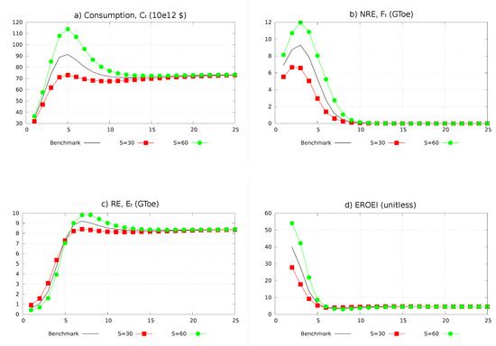Based on ranges given in [42], we take the following EROEI values: 30 for wind energy, 10 for solar energy, 25 for geothermal energy. Taking the average of these values, the EROEI for RE without hydroelectricity is 21.67. For hydroelectricity, we assume a EROEI equal to 80 (a plausible guess) and a share of hydroelectricity in total RE production initially close to 86.9% (see [1]). Equation (A25) then gives: