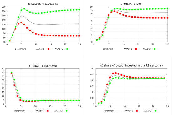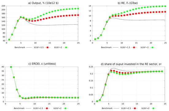 - Equation (28) can be easily understood when computing the net energy consumption of the energy sector: it is the energy content of the units of capital invested in RE. Since each unit of final output has an energy content of and is made from of such units, its energy content amounts to . Accordingly, (the ratio between the output of RE sector () and its own energy needs) is equal to , i.e., the inverse of .