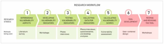 The literature review performed at Stage #1 let us compile a set of vulnerability aspects that we found to be of primary importance to the targeted sectors. While a detailed description of the review results is outside the scope of this study, a majority of studies reviewed addressed how vulnerable groups such as elderly, disabled, and young children are vulnerable to heat, and—to some extent—to flood (e.g.) [20,21]. Moreover, the rich literature on anticipated climate vulnerability in buildings emphasized both flood and heat impacts in different building types and for various building materials [13,19].