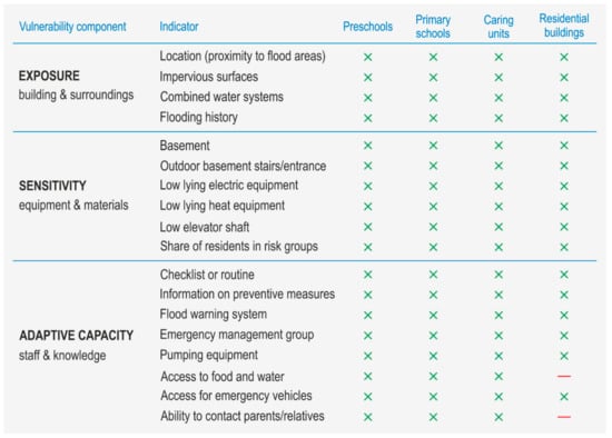 Generally formulated aspects identified as important in influencing vulnerability within each of the targeted sectors were categorized as: (a) exposure, (b) sensitivity, and (c) adaptive capacity. Consequently: (a) aspects related to the location of buildings, outdoor spaces and associated infrastructure in relation to flood-prone areas and heat islands were categorized as exposure components, (b) aspects related to building type, its materials, placement of critical equipment, and share of residents in risks groups were categorized as sensitivity components, and (c) aspects related to preparedness to respond to flood or heat impacts such as availability of checklists, warning systems, and pumping equipment were categorized as adaptive capacity components.