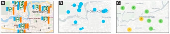 One auxiliary layer only concerns heat vulnerability, it displays urban heat islands (UHI) in downtown Norrköping (Figure 7C) and was compiled by combining Oke’s model with a wind flow analysis [43]. This layer displays the UHI intensity of different areas, i.e., streets in Norrköping, by coloring street segments accordingly.