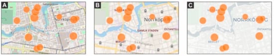 The preschools sector’s scores (circles) on flood (A and B) and heat vulnerability (C) shown with auxiliary thematic layers: (A) water range after a +2m sea level rise, (B) water range if 100-year flood of Motala ström occurs, and (C) the heat island in central Norrköping.