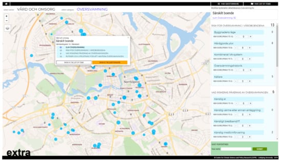 The questionnaire panel can be enabled either from the main window or from the pop-up window that shows up if an object is selected. It allows altering scores if they are not in line with user observations, or if already implemented adaptation measures have decreased the unit’s vulnerability. By default, the questionnaire is propagated with the scores collected at Stage #4. If the user selects an object, e.g., Servicebostad in Figure 6, the questionnaire shows its scores. Then, the user can alter the scores and submit them to the database.