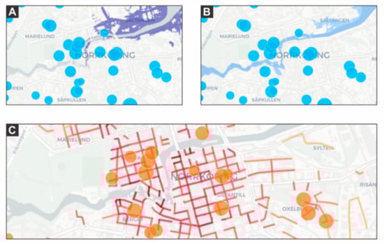 Most of the auxiliary layers concern vulnerability to floods. For example, the layer showing potentially flooded areas after a +2m sea level rise (Figure 7A) was calculated based on a digital elevation model. In turn, the water range of the 100-year flood of Motala ström (Figure 7B) was obtained from the municipality of Norrköping [42].