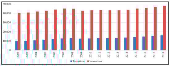 Analyzing the average GDP per capita for the European countries considered in the analysis (see Figure 1), we can point out the differences between the two groups of countries. The average GDP per capita for the transition countries represents a quarter of the GDP per capita of the innovation-driven countries. Moreover, both groups had an ascending trend until 2008, after the outburst of the recent financial crisis the average GDP per capita for both groups of countries registered a decrease. Starting with 2013, the European economies have begun to recover and have resumed their upward trend, both for developed and less developed countries.