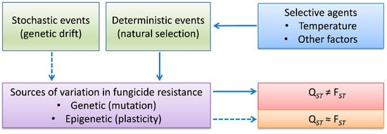 Determining the types and intensity of natural selection acting on quantitative traits such as the development of fungicide resistance in pathogens is a challenge but can be achieved by a comparative analysis of population differentiation in the concerned quantitative traits estimated by (QST) and population differentiation in neutral genetic markers estimated by fixation index (FST). The theory behind this comparison correlates with Fisher’s theorem of natural selection: Traits that are under selection will exhibit different levels of genetic differentiation with other parts of the genome [,], generating a different pattern of QST in fungicide sensitivity and FST in simple sequence repeat (SSR) marker loci. In contrast, random genetic drift affects the entire genome equally. Consequently, neutral marker loci are expected to show a similar level of differentiation among populations, leading to the same level of QST in fungicide sensitivity and FST in SSR marker loci. QST can be estimated by partitioning the total phenotypic variation to within- and among-population components in a way similar to the estimate of FST in neutral genetic markers [,,]. Many genetic and environmental factors including chemical property, pathogen biology, fungicide operational scheme, and climatic conditions can affect the types and intensity of natural selection and, therefore, influence the development of fungicide resistance in pathogens []. Temperature, a stronghold abiotic environmental factor that influences all biological and biochemical activities of species, could affect the evolution of fungicide resistance in pathogen populations by regulating the generation and maintenance of genetic variation in target genes, metabolic and enzymatic activities of cells, as well as types and intensity of natural selection [,,,].