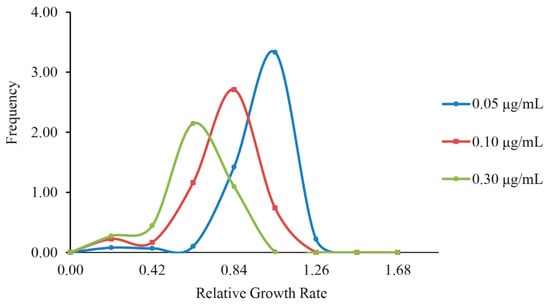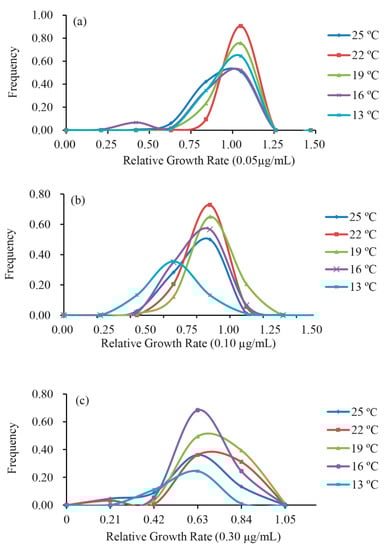 In the current study, the distribution of fungicide sensitivity of the P. infestans populations to the five different experimental temperatures was investigated. The relative growth rate (RGR) of the isolates from the nine pathogen populations displayed continuous unimodal resistance distribution in all the three azoxystrobin treatments, across the thermal regimes (Figure 3 and Figure S1). Pathogen population showed high sensitivity to azoxystrobin at 22 °C in 0.05 and 0.10 μg/mL, followed by 19 °C (Figure 3a,b), respectively and were least sensitive at the lowest temperature 13 °C in 0.10 and 0.30 μg/mL (Figure 3b,c). The pathogen populations grown at 16 °C displayed maximum sensitivity at the highest azoxystrobin concentration 0.30 μg/mL (Figure 3c). The relative growth rate also displayed a continuous and unimodal distribution in all the three azoxystrobin concentrations when all 180 isolates grown in the five temperatures were combined (Figure 4). As fungicide concentration increased, the mean RGR of the isolates decreased (Figure 4).