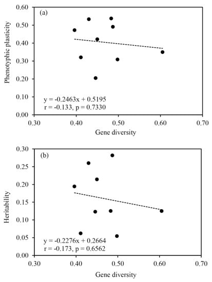Correlations between gene diversity in the SSR markers loci and (a) phenotypic plasticity (variance of genotype × concentration); (b) heritability (genetic variance).
