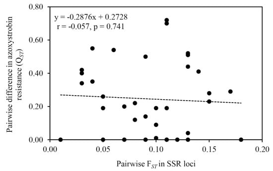 Correlation among the pairwise population differentiations in SSR marker loci (FST) and differentiations in azoxystrobin resistance (QST) in the nine P. infestans populations. The pairwise FST and differentiations in azoxystrobin resistance QST were measured by RGR over the three fungicide concentrations (0.05, 0.10, and 0.30 μg/mL azoxystrobin).